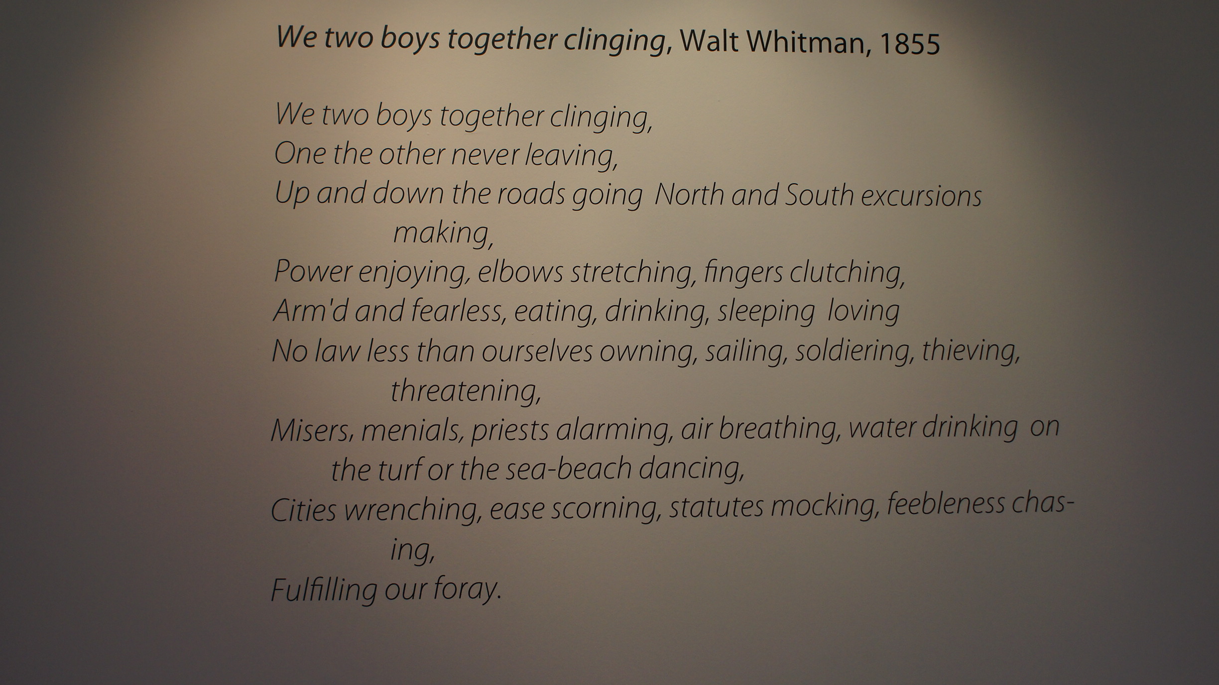 One of the first things I noticed is the fact that unlike other exhibitions in the UK, Early Reflections suggested start is on the right hand of the space, an interesting choice, probably dictated by the exhibition space, nonetheless this confuses the visitors, forcing them to go through the exhibition in the opposite direction to what was intended; during my visit this occurred several times. Within this section, we find what is probably one of the most important pieces in the exhibition after the Pool paintings: We Two Boys Together Clinging, which is placed in a highly visible position, above it, a quote by the artists explaining the importance of writing in his paintings. To the left a label, one of the largest ones in the exhibition, gives us technical information such as the date it was created and technique, but the most interesting fact, is the provenance which is located at the bottom after two paragraphs giving context to the work. These texts invite the reader to interpret the painting on his or her own instead of imposing the curators’ own interpretation. This is a very prominent feature in all of the exhibition’s information system (Fig. 5). The curator uses her knowledge to enhance the visitors experience, offering the valuable information in a challenging and inviting way. Every label contains facts, data and bits of trivia that together with the objects in the exhibition educate the visitor without pandering or being patr onising. In terms of layout, this hub consists of six pieces, four paintings and two studies. One disappointing aspect of these studies is that unlike in other parts of the exhibition, we are not shown what the finished work of art looks like.