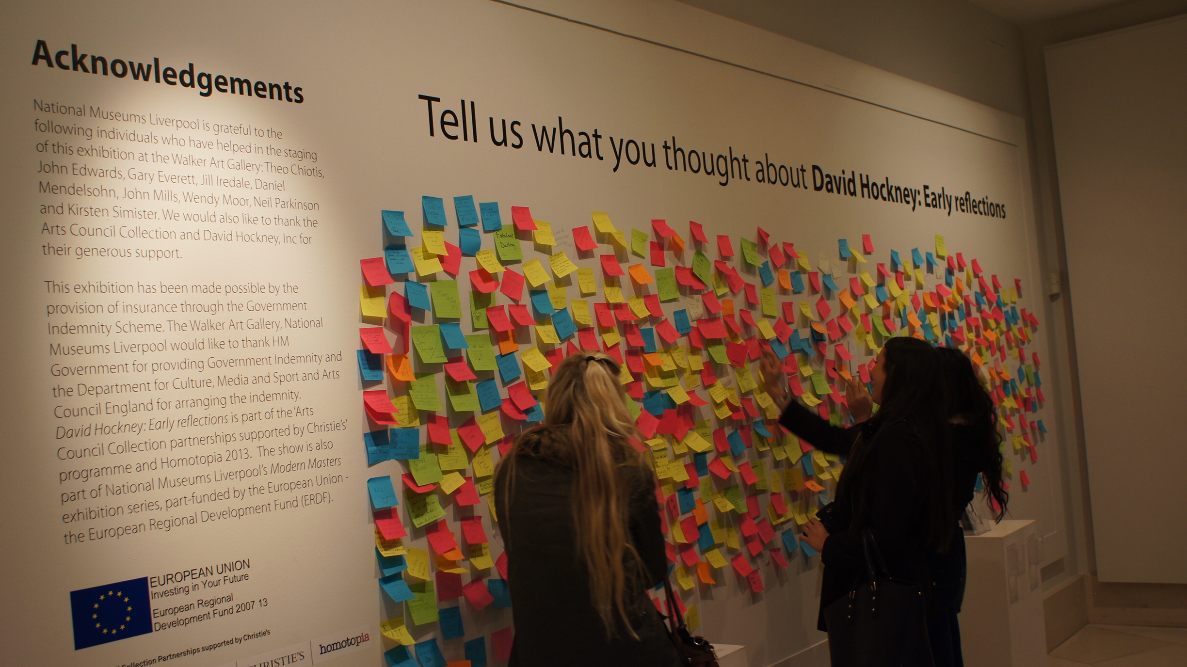 As one walks out of the exhibition a final set of activities await for those visitors that wish to further their understanding of the artist and his work. A computer offers the possibility to search the museum’s website and visit the accompanying website, while a media centre plays a shortened version of the Jack Hansen’s film, A bigger splash, based on the artists lifestyle, and working methods, while a collection of books on the artist and gender are offered for further insights. Next to this, a message on the wall invites the visitors to write their opinions on post it notes and paste them on the wall. A cursory inspection of this section shows us the reactions visitors to the gallery had. While most of them seem to have really enjoyed the exhibition, negative comments can be found, mostly questioning the artist’s artistic abilities, and while homophobia wasn’t overt or hostile, the words “disturbing” and “uncomfortable” crop up quite often. The final objects before leaving, are a selection of catalogues and applications for the John Moores Painting Prize, and pictures of David Hockney wining the award in 1967.