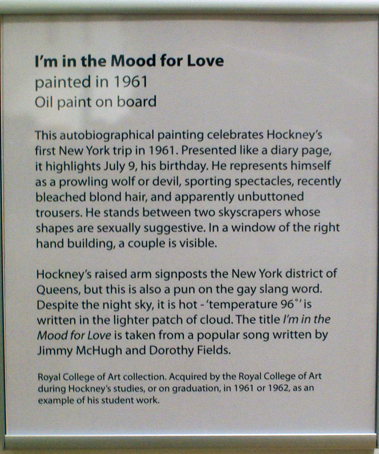 Something only mentioned in passing is the direct links between Hockney’s homosexuality and the art he created. In the mood for love, is the first section of the exhibition, we get one of the more openly gay themed works in the exhibition, We two boys…, in it, the introductory panel dedicates an eighty word paragraph to the legal situation in the UK at the time and its relationship with the artist. The last paragraph is a statement on his passion and t he risks he took in creating what Hockney himself calls homosexual propaganda. The rest of the labels explain some hidden gay symbols and codes.