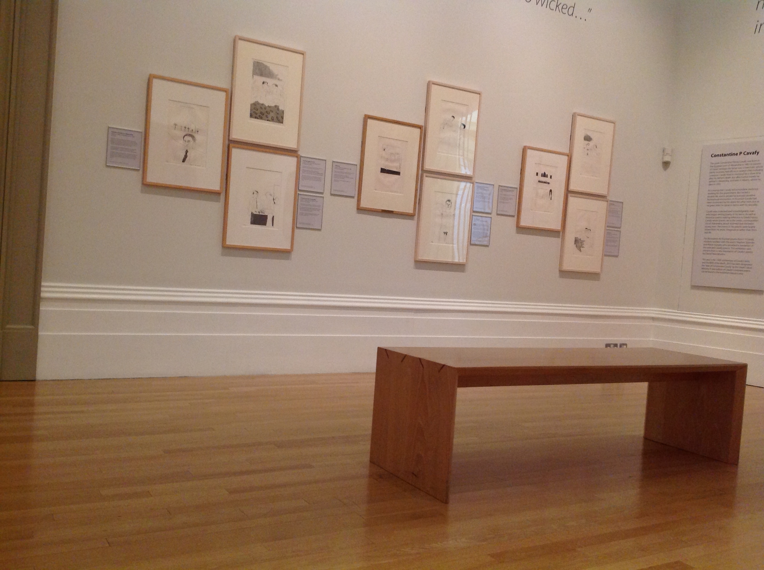 The first thing one notices when walking into the Picturing Poetry hub is the layout, the prints are hung in blocks of three with the first one in the series sitting alone while to the right of it the next two sit on top of each other creating a pattern of triangular shapes. I had the opportunity to talk to the curator about the arrangement, and discovered the reason behind was to accommodate all the illustrations, it is a visually pleasing arrangement elegantly solving the space problem. While the central works in this section are the illustrations for Constantine P. Cavafy’s thirteen poems, we also find two illustrations for a collection of the Brothers Grimm fairy tales, a print related to Hockney’s visit to America, and for some reason an unrelated oil painting whose aesthetic seems to relate more to the previous section than to this one, perhaps placed here for lack of space. The labelling here is slightly problematic: the main panel is hidden behind a door, the glossary on a side wall and the individual labels for the triangular arrangements can be confusing as they don’t relate physically to their corresponding prints entirely, that is, each one is aligned to the other labels, not to the paintings and while one of the labels is to the left of the group, the other two are two the right, creating an overlap when two groups of labels meet between the frames.