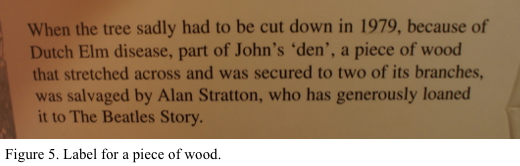 The object becomes relic, imbued with its owner’s material biography, an extension of the Beatles, vivid, knowable, its memories spoken through every crack, word, and scratch; In a way a voyeuristic experience (Dudley, 2010, p.119). Authenticity as a fetish, a childhood’s treehouse beam, turned into a museum piece due to its contact with a person of historical significance (Harrison, 2010, p.33).