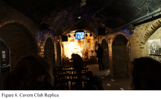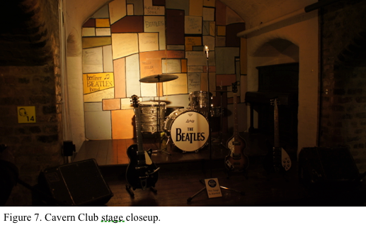 At the other side of the spectrum we have experiences such as the Beatles Story, where things are recreated outside of their original sites utilising the actual objects. The Cavern Club is recreated with faux brick, yet the stage (Fig. 6) is the stage used in the creation of a music video made there. Certain parts of the decor date back to the period the Cavern was open. Original musical instruments can be found around the entire exhibition, as well as original letters, even a beam from John Lennon’s tree house. In this case authenticity trumps everything, the lamination focuses on the object not the space, the pedigree is impeccable (Jordanova, 2000): this belonged to John, that was signed by Paul, those are Ringo’s suits, and so on.