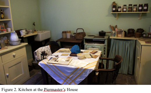 When we go to the Piermasters house we walk into a kitchen space (Fig. 2), in front of us is a barrier and beyond it we see a dinner table with books and article clippings conveniently open to news of the war, a kettle in a blue tea cozy seats in the middle next to a single ceramic bowl, to the left is a meat grinder, and a lone spoon. The whole set up is interesting in many ways, an entire wall is left empty to accommodate museum visitor, and the barrier itself physically frames a still life, one where elements are placed not for their relationships between themselves but for what they represent. Newspapers open on war news, Air Raid Precautions leaflets and books on the war are used as chrono-contextual cues to remind the visitor of what was happening at the time. A tea kettle in the middle with a cozy as a symbol of the United Kingdom and also as a lived in element: tea is ready and is on the table. A spoon and a meat grinder sit in there to inform us that food is prepared and eaten there. At the same time however, this is incongruous with a “real” house. There is a teapot but no teacups, the spoon is not a teaspoon, the literature spread out in a very spread up easy to see way so the visitor can read what they are and grasp their importance, the meat grinder is placed far from the sink where it would normally be placed so its visible, all four walls of a house compressed into three. Susan Vogel remarks: